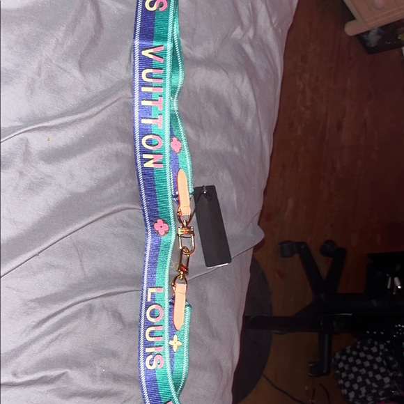 Stylish Louis Vuitton strap with vibrant colors. Features blue, green, and pink accents. Perfect for adding a pop of color to your accessories.