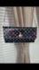 Chic black clutch with vibrant multicolor monogram. Elegant gold chain strap. Perfect for stylish outings.