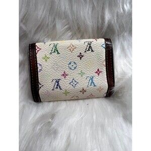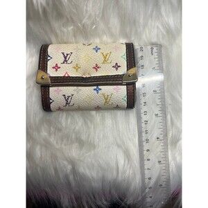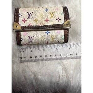 Preloved Louis Vuitton Murakami White Monogram Multicolor Porte Monnaie Plat Coin Purse or Compact Trifold Card Holder. 4 x 2. Perfect for pocket or mini crossbody. This has lots of love but still adorable and functional.