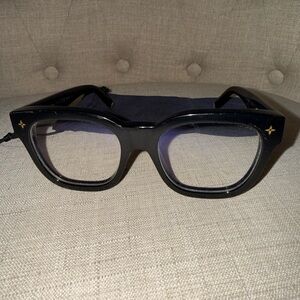Elegant black frames with gold accents. Iconic Louis Vuitton design. Perfect for a stylish look. Lenses and frame have scratches. The gold on the Monogram motifs along the temples have faded.
