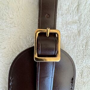 Preloved Dark Brown Leather luggage tag with Goldtone hardware, size Large. Made in France. Authentic Louis Vuitton tag hand painted with an image of Vivienne.