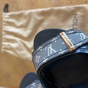 Navy blue patent leather peep toe high heel pumps with a Monogram Idylle canvas strap on top, complete with a small logo plaque in gold hardware. Size 39.