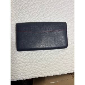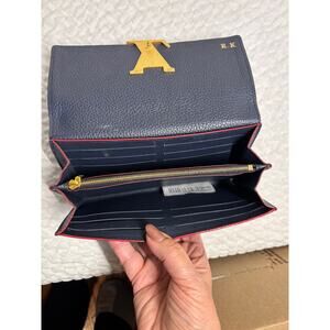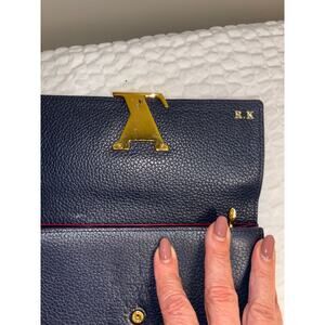 Louis Vuitton Navy Leather Envelope Wallet. Pink accent. Preloved but in excellent condition. Add an after market chain to make it a clutch. See pictures for more details.