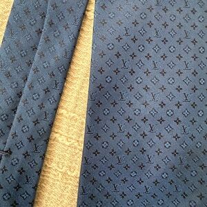 100% Silk navy tie with classic LV monogram design. Pre loved and in pre worn condition, small dark stain on the front (see photo) therefore it is priced the way it is to reflect the condition .