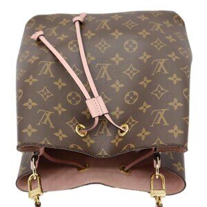 LOUIS VUITTON NeoNoe MM in Monogram canvas with pink accents. Designed with a drawstring closure, adjustable strap, and spacious bucket shape for everyday style.
