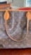 Elegant authentic Louis Vuitton tote featuring iconic monogram pattern. Rich brown and tan exterior with vibrant red interior. Perfect for everyday use.
