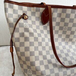Pre-owned Louis Vuitton Neverfull Damier Azur Canvas with natural cowhide trim and gold-colored hardware.