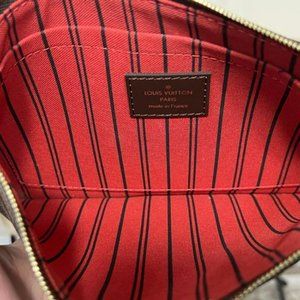 100% Guaranteed Authentic LOUIS VUITTON Damier Ebene Neverfull MM GM Pochette in Excellent used condition with RED interior as pictures show.