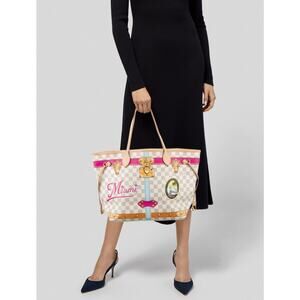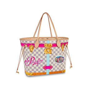 Capturing the spirit of summer, Louis Vuitton reinterprets its iconic Neverfull in tribute to the world's most celebrated resorts. Vintage-style lettering and colored lining matching the outside print add to the appeal of this limited-edition holdall, whose practical features and generous proportions make it the perfect choice for both city and beach.