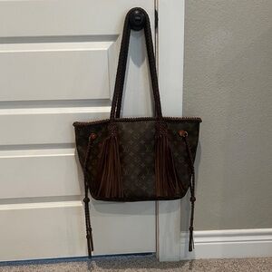 LV refurbished neverfull LV tote bag. Braided handles. Fringe details on both sides. Inside zipper pocket. Purchased from reputable company that refurbishes authentic Louis Vuitton Bags for a boho/western look. Great condition.