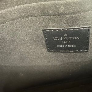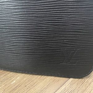 Authentic Louis Vuitton Neverfull Epi Wristlet. Black leather with silver hardware and a microfiber interior. Can be used as a clutch or wristlet or small makeup bag.