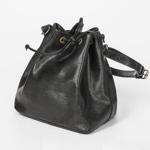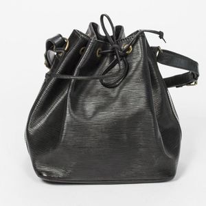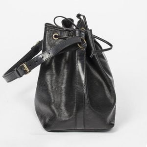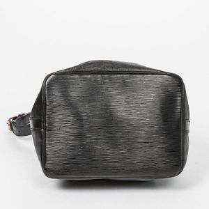 LOUIS VUITTON Noe PM in Black Epi, with black calf leather strap. Golden brass hardware. Black suede leather interior, with one zip pocket. Production code A20952, Model from 1992. Normal signs of wear on the black epi leather around the zip pocket inside the bag. Scuffs on the black epi leather on the front side of the bag. Few scuffs on the black epi leather on the bottom of the bag. One small pen mark on the black epi on the bottom. Signs of wear on the black calf leather strap.