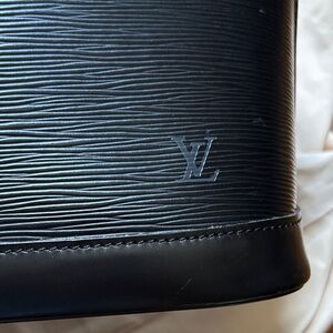 Chic Louis Vuitton bag in noir Epi leather top handle bag. Features elegant gold accents. Ideal for stylish outings. Found on real real using some pics for example of listing. This bag is in very good condition with very few scuffs, small imperfections shown in photos!