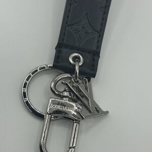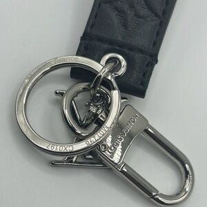 This Louis Vuitton Novelty Dragonne Key Holder Key Chain in black features a solid pattern with the brand's iconic LV monogram logo accents. Made of leather and metal, this one-size key chain is a designer accessory that is multifunctional and perfect for women who appreciate high-end fashion. Crafted in France, this key chain adds a touch of luxury to any outfit, making it a stylish and practical addition to your accessories collection.