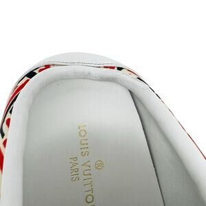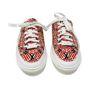 Step into bold luxury with these Louis Vuitton Nylon Monogram Crafty Open Back Sneakers. From the limited “Crafty” collection, they feature red and black patterned nylon with smooth white leather trim, gold-tone eyelets, and branded lace keepers. The slip-on mule design makes them a chic and comfortable choice for casual wear.