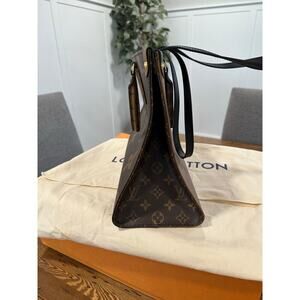 Giant Monogram coated canvas with Reverse Giant Monogram coated canvas. Leather top handle and strap. Gold hardware.