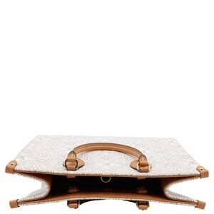LOUIS VUITTON Onthego MM in Jacquard 1854 fabric with a chic off white finish. Designed with a spacious interior, dual handles, and signature heritage pattern for a refined everyday look.