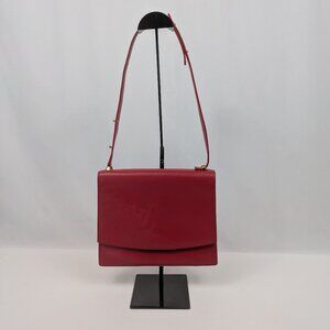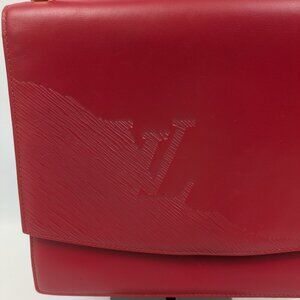 Very attractive, sharp looking red leather bag with epi leather logo decoration on the flap. Strap needs repair. Could be glued, riveted, stitched or even replaced with a strap of your choice. A gold chain link strap would give it a modern chic look. Last picture gives an idea of a link chain (not included). Inside zipper is zippy but is missing pull fob. Will complete any outfit. Smoke and pet free home. Comment with questions.