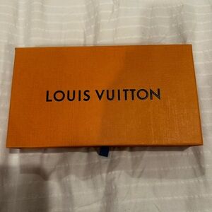 Elegant Louis Vuitton box in vibrant orange. Includes a soft cream dust bag. Ideal for luxury storage of long wallets or accessories.