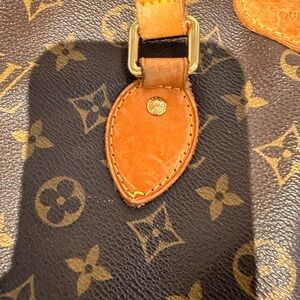 Elegant Louis Vuitton tote bag in classic monogram design. Features rich brown tones with tan leather accents. Perfect for adding a touch of luxury to any outfit. No detachable interior pouch but there is an optional hook inside for yours.