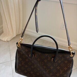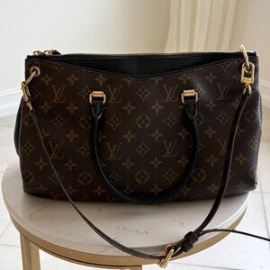 2018 Louis Vuitton Monogram Canvas Pallas Full Noir Black. This bag features monogram canvas at front and back, black cowhide leather sides, double handles, adjustable shoulder strap, gold tone hardware, double zip closure and microfiber lining with three flat pockets and a d-ring. Measures 13.7″ x 9.8″ x 5.3″. Strap drop is 10″ – 13″. Made in U.S.A with imported materials. Date Code/Authenticity SD0118. This bag is in next to new condition. There is a scratch to one of the zipper hardware. Excellent exterior condition and interior well-maintained. Comes with dust cover and tags.