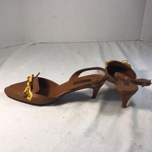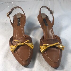 Step out in style with these elegant designer brown leather pointy toe adjustable sling back mule sandal with a tied ribbon accent and 2 inch heels. Perfect for any occasion, these shoes offer both comfort and sophistication. Gently worn but still in great condition other than minor scuffs on heels as shown in photos! Size reads 38 (7.5-8US) but measures 10 inches from toe to heel.