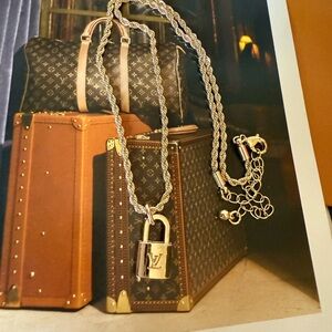 Authentic Louis Vuitton Gold tone LV Logo Small Padlock Pastilles Charm, repurposed into Chic Necklace.