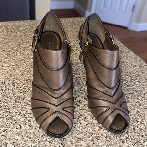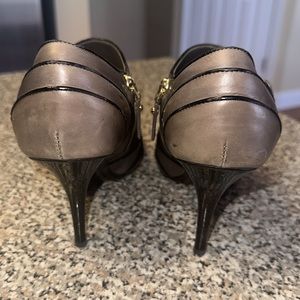 Shoes have done wear and fading throughout (as shown in pics). The color is more of a taupe color in my opinion.