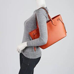 EUC LV Piment (orange) Epi Neverfull in the PM size. Beautiful alcantara microfiber lining with silver hardware. Handles, cinch straps and all interior rings are in excellent condition. Interior lining has some staining (if it bothers you, grab an insert!) and the exterior has very minor wear. Bottom corners have some darkening and there is a scratch towards the top opening on one side (see photo).