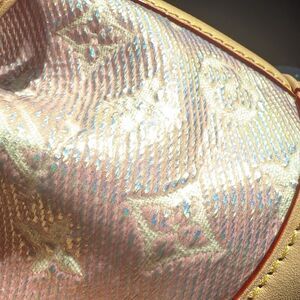 This luxurious crossbody bag from Louis Vuitton showcases a soft pink monogram Monoglam Coated Canvas with vachetta leather trim. The bucket-style design offers ample space, while the durable canvas material ensures longevity. Its elegant drawstring closure and gold tone metallic hardware add a touch of sophistication to any ensemble.