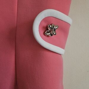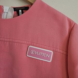 Chic short-sleeved dress with an upbeat, retro feel. Crafted in a timeless straight cut from wool-silk cady crepe in a playful pop color. Martingales define a feminine waistline, trimmed with contrasting scuba jersey and embellished with sculptural palladium knot buttons. Fastened with the collection’s essential oversized zipper and signed with a rubber Louis Vuitton patch.