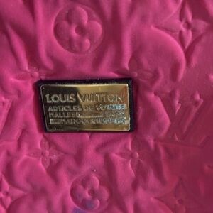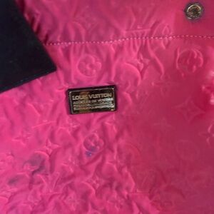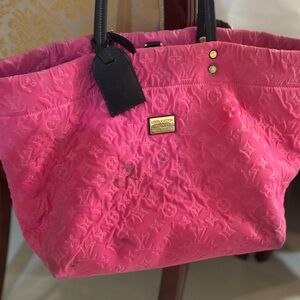 Vibrant pink tote with signature monogram. Features sleek black handles. Ideal for stylish outings.