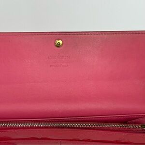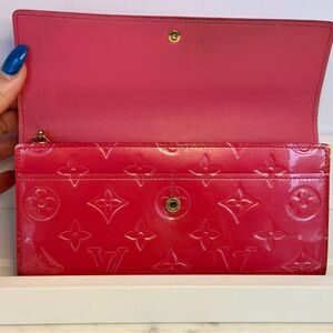 This is an authentic LOUIS VUITTON Vernis Sarah Wallet in Rose Indien. This Louis Vuitton wallet is crafted of monogram embossed patent leather in a gorgeous dark pink with smooth pink leather sides. The wallet has a gold snap (does not snap closed needs repair) that opens the front flap to a partitioned interior of matte leather, card slots, a zipper compartment, and a bill pocket.