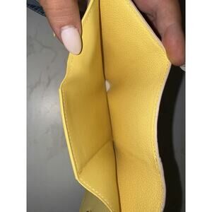 This Louis Vuitton Victorine wallet combines elegance with functionality. The pink exterior showcases the iconic monogram pattern, while the vibrant yellow interior offers a cheerful contrast. Despite minor scratches inside, it remains in excellent condition. The wallet includes the original box and dustbag.