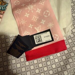 Elegant Louis Vuitton scarf with pink and multicolor design. Features iconic patterns and vibrant accents. 2023 andVivienne Bandeau only.