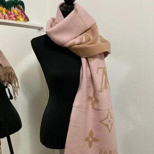 Elegant pink scarf with tan iconic patterns. Adds sophistication to any look.