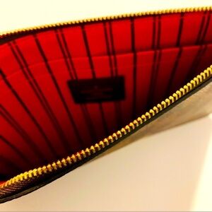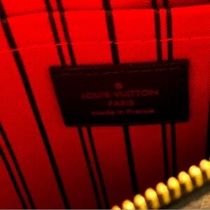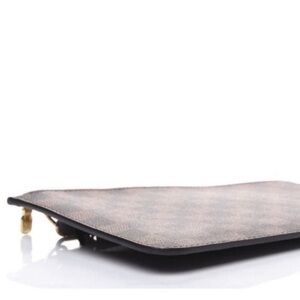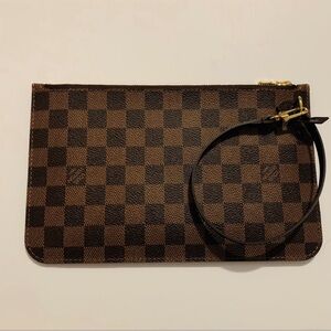 The Louis Vuitton Ebene Neverfull MM GM Pochette is crafted from elegant Damier Ebene canvas with natural cowhide trim. Slim, comfortable slip items inside easily. Can be used as a stylish wristlet or remove the strap and use as a clutch. The pouch features a brown leather wristlet strap and a polished gold top zipper that opens to a red striped fabric interior with a patch pocket. Approximate measurements: 9.75” x 5.75”. Comes with a dust bag. Please no comments about pricing; please use the offer feature. Bundle with another item for discount. Comes from a pet and smoke free home.