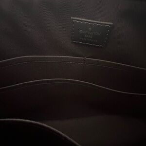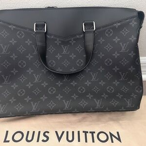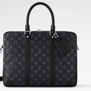 The timeless black-and-gray colorway of Monogram Eclipse canvas perfectly complements the pure lines of this Porte-Documents Voyage PM briefcase. Black-leather top handles, side bands, and reinforced corners structure the bag’s design. A removable and adjustable strap and two top handles give carry options.