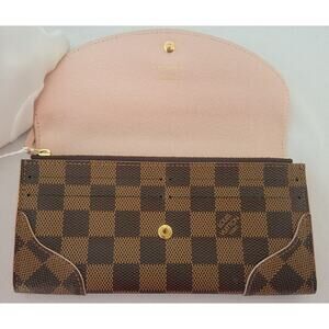 This stylish and feminine wallet is crafted of signature Louis Vuitton Damier check on toile canvas with light pink resin glazing. This wallet opens to a front card slot panel with a built-in zippered pocket and a light pink cross-grain leather interior with an open compartment for storage and two additional bill pockets.