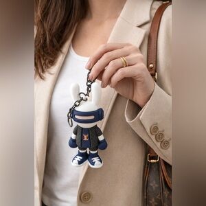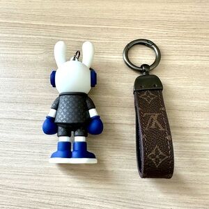 Louis Vuitton rabbit keychain featuring a designer-style outfit with LV-style monogram detailing. The set includes a collectible bunny figure charm and matching monogram-style strap key ring. Comes with an orange LV-style presentation box. Cute statement accessory for keys.