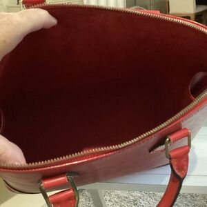 Authentic pre-owned Louis Vuitton Epi Alma PM tote in red, 13”W x 10”H x 6 1/2”D, in like new condition.
