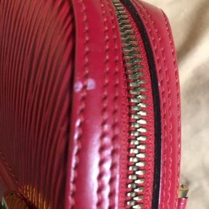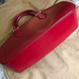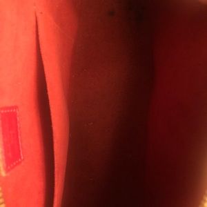 Embossed leather bottom right corner, Alcantara red lining. Single pocket in the interior wall and two way zip closure. Bag is in great condition, minor scuff on the front and by the zipper (see pictures) Interior has some signs of wear and 1 small stain. Includes dust bag.