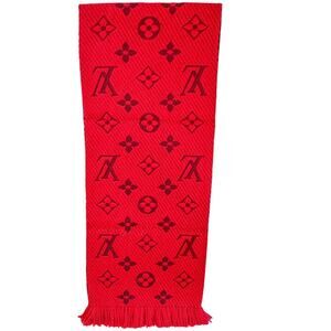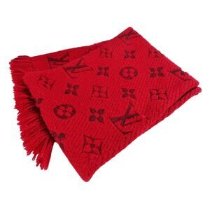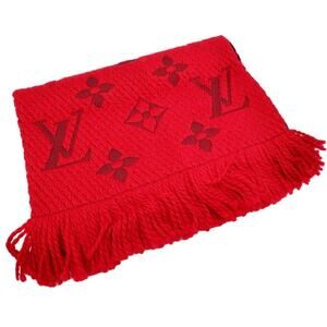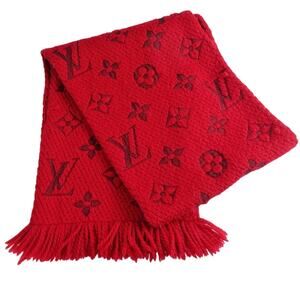 The product is a Louis Vuitton Logomania scarf. This red scarf features the iconic Louis Vuitton monogram woven into a blend of wool and silk.