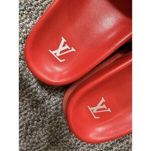 These Louis Vuitton slides combine style and comfort, featuring the iconic monogram design and bold red color. Ideal for casual or relaxed outings.