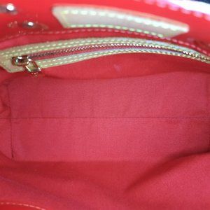 Glossy red patent leather. Embossed monogram design. Tan leather handles.
