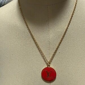 Chic Louis Vuitton pendant with bold red design. Gold chain adds elegance.