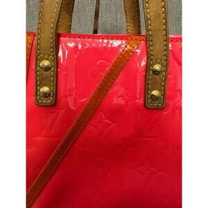 This is an authentic Louis Vuitton Vernis Reade PM handbag purse in a rose color. This stylish tote is crafted of Louis Vuitton monogram embossed vernis patent leather with a rust orange leather streak applique. The bag features vachetta cowhide leather strap handles and a broad open top to a matching interior. Interior pocket.