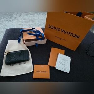 This edition of the Romy card holder is offered in Monogram Empreinte embossed leather. In addition to cards, this elegant and versatile piece holds cash, coins or receipts in a zipped, gusseted pouch accented with an LV Circle pull in gold-finish metal.