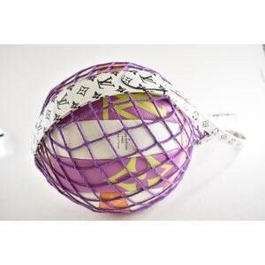 Sized at 8.27 inches in height, the Louis Vuitton Giant Volleyball comes with a net bag for carrying; the net bag sees a purple mesh body that’s secured to a black and white leather monogram carrying handle