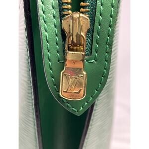 This authentic Louis Vuitton Saint Jacques handbag in striking green Epi leather is a rare vintage find from 1994 (code VI0994). Crafted in France, it features the iconic textured Epi exterior, structured silhouette, and gold-tone zipper with LV-engraved pull. The spacious interior is lined in soft gray suede with a slip pocket—perfect for daily essentials.